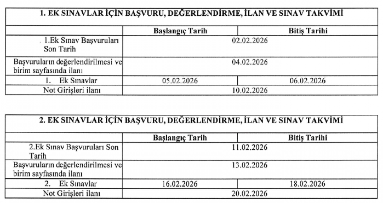 Azami süreler sonunda kayıtlı olduğu öğretim kurumundan mezun olabilmek için son sınıf öğrencilerine, başarısız oldukları bütün dersler için iki ek sınav hakkı verilir. hükmü çerçevesinde 2025-2026 Eğitim-Öğretim yılı Güz yarıyılı sonunda azami süresi sona eren bölümümüz öğrencileri için ek sınav takvimi aşağıda verilmiştir.